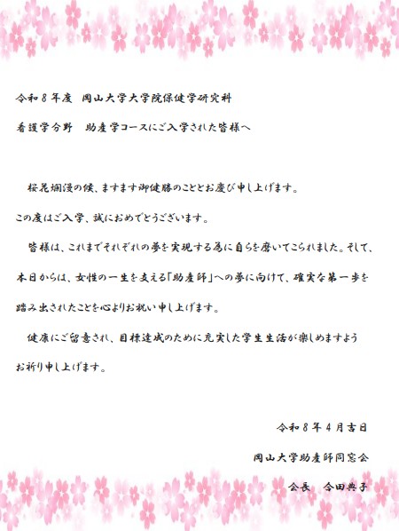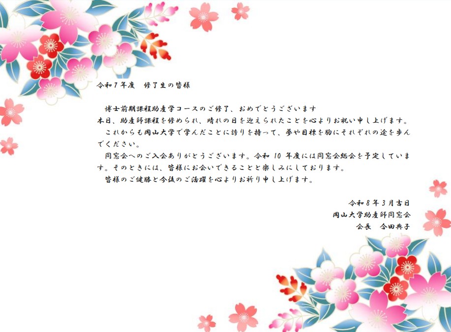2024年12月末までに、「岡大助産師同窓会 会誌10」を郵送しました。